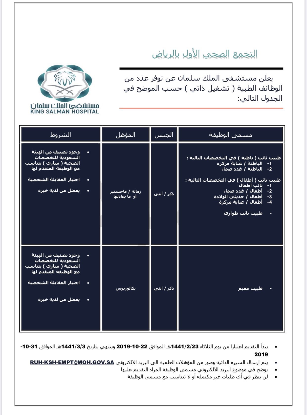 الأخبار الصحية On Twitter مستشفى الملك سلمان بالرياض يعلن عن وجود عدد من الوظائف الشاغرة على برنامج التشغيل الذاتي وظائف طبية ووظائف صحية غير طبية وهندسية وإدارية والخدمات العامة والتقديم